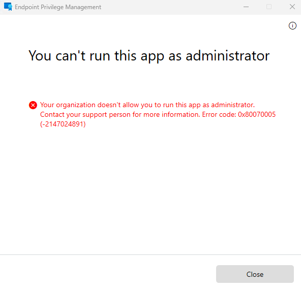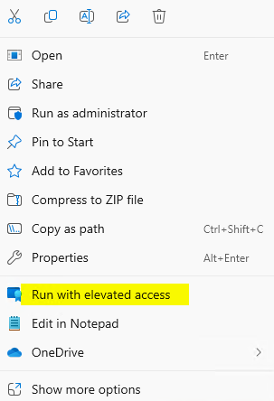 3. The end user can now "right click" on a file and launch it with "Run with elevated access". If a file is 'recognized' from an elevation rules policy, it will successfully launch elevated and trigger the elevation conditions and if the file is unknown there is an error message.