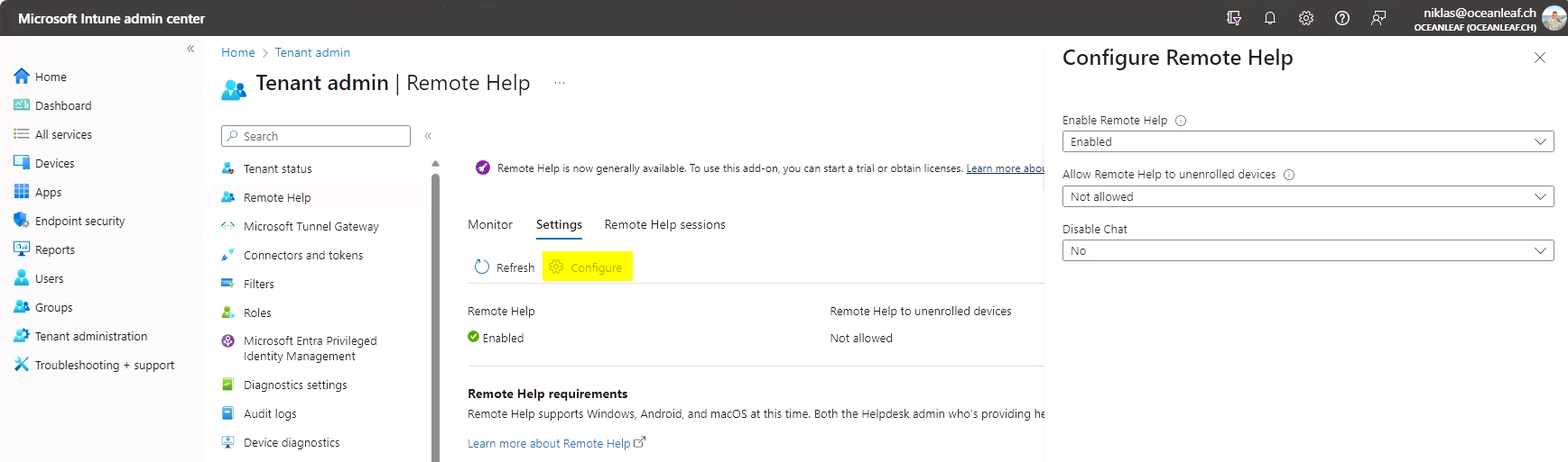 - Enable Remote Help in the tenant
