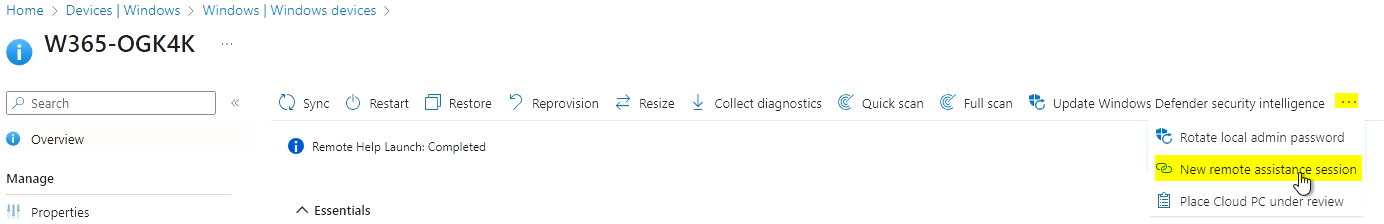 3. You're ready to start remote assistance ๐ as IT admin go to a device in Intune and choose "New remote assistance session"