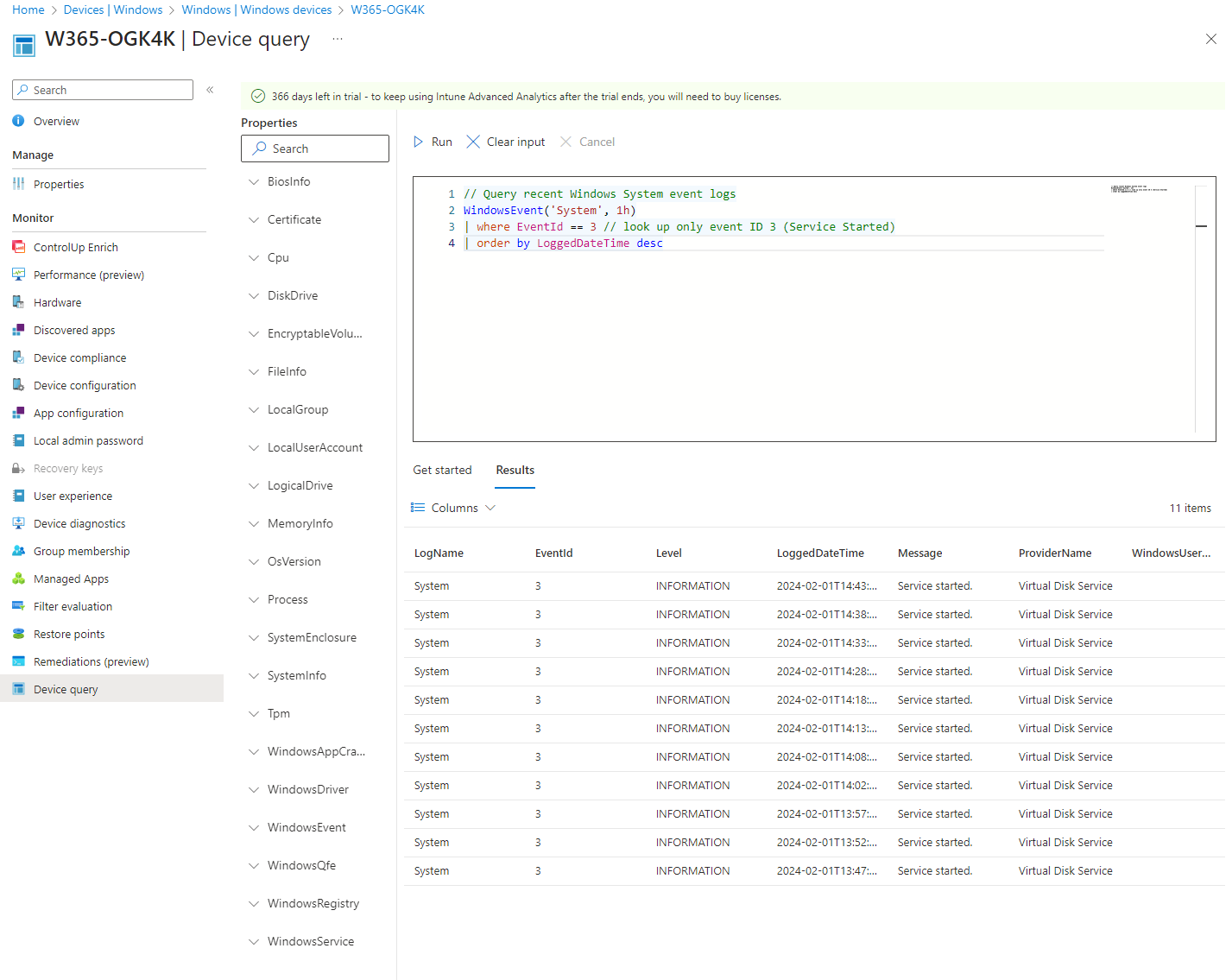 Even more powerful is the real-time device query, powered by KQL, which is accessible from a device object in Intune: