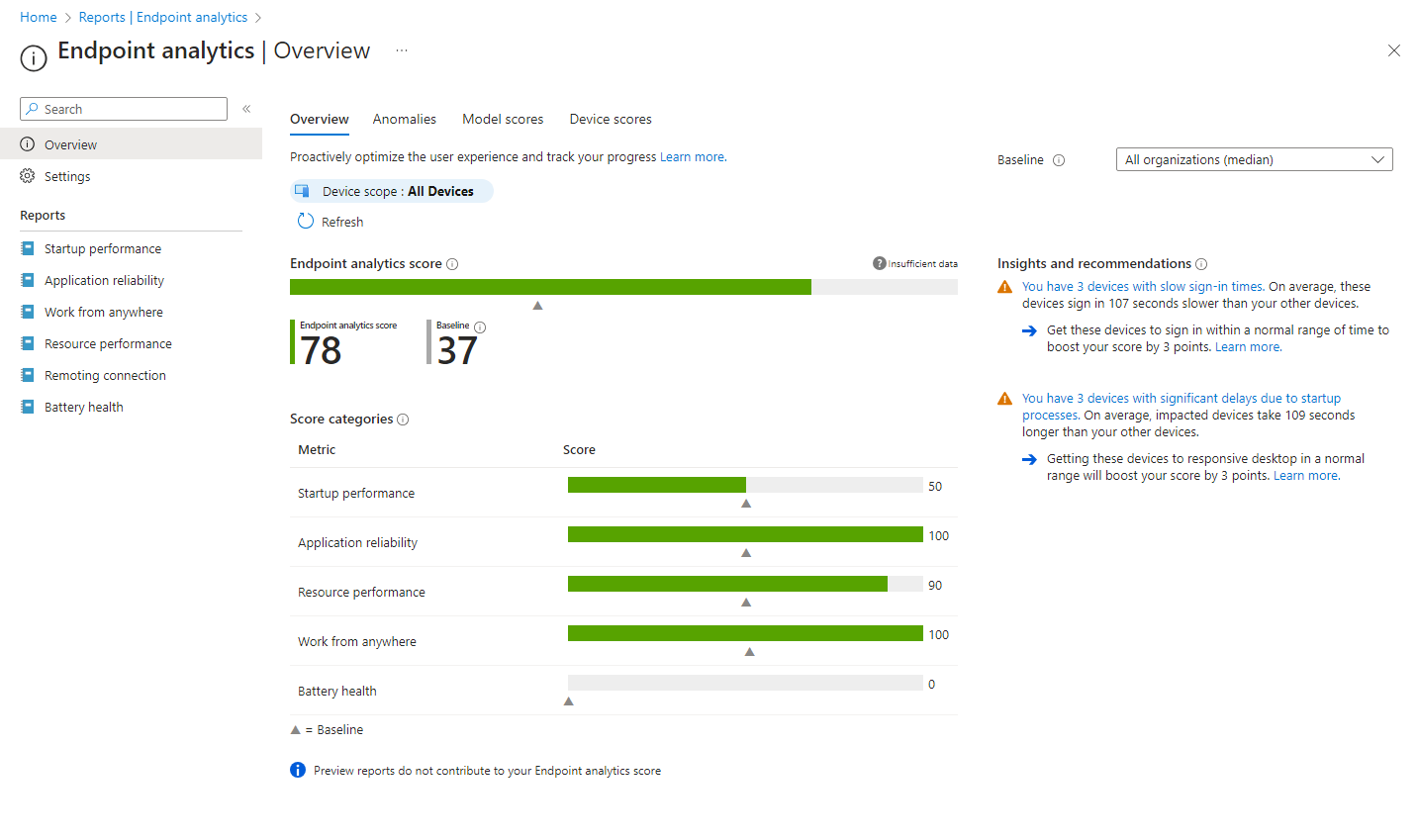 Navigate to Intune > Reports > Endpoint analytics and find everything related to reports, anomalies and scores for different categories. At the right you already see insights and recommendations.