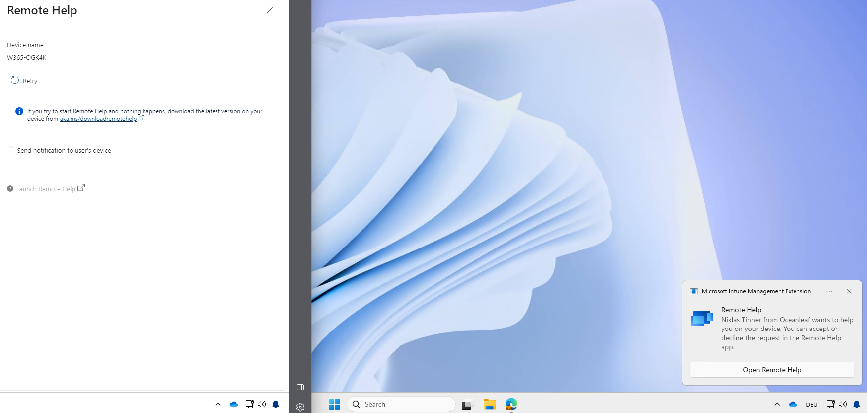 4. A notification is sent to the user's device (right PC), he needs to "Open Remote Help"