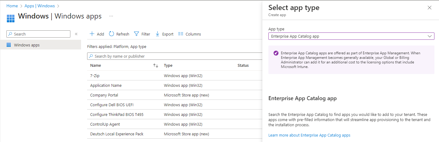 Navigate to Intune > Apps > Windows and add a new App from the category Enterprise App Catalog app: