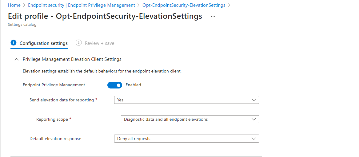 - Create an elevation settings policy in Intune to define the behavior of EPM elevations for end users