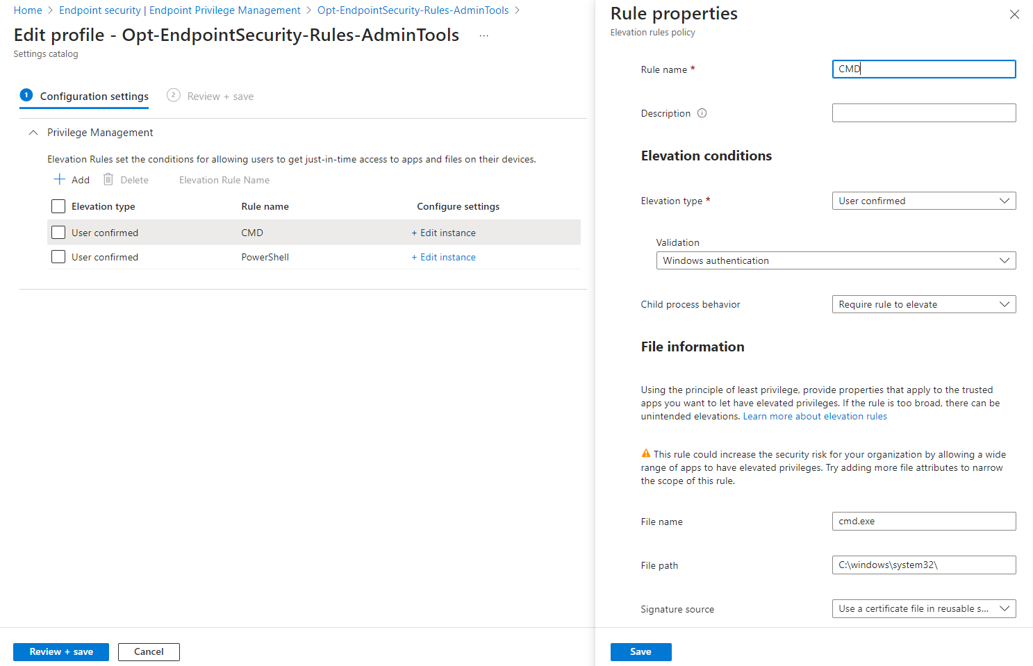 2. Create a elevation rules policy in Intune to detect files that are allowed to elevate with EPM, configure the elevation conditions and file information