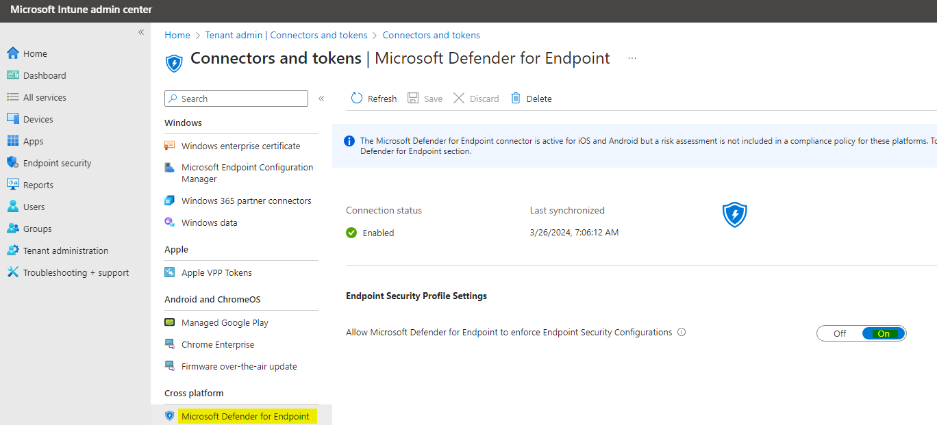 Go to Tenant administration > Connectors and tokens > Microsoft Defender for Endpoint and enable 'Allow Microsoft Defender for Endpoint to enforce Endpoint Security Configurations'