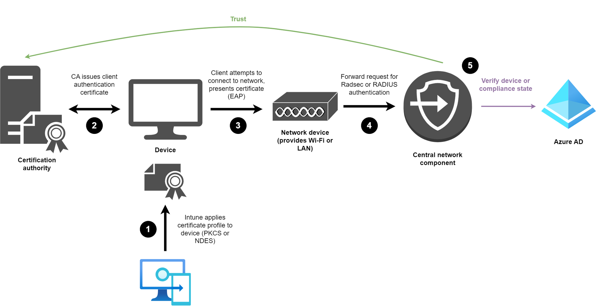 Another challenge is the configuration from the network side. Your clients typically talk EAP (TLS) with the end network device which could be an access point or switch and these then forward the request to a central component, that can handle RadSec or RADIUS protocols in order to validate the authentication request.
