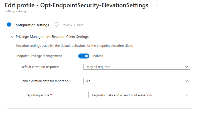 - ⚙️ Elevation settings policy > the behavior of EPM on the systems, contains reporting, default elevation response and validation