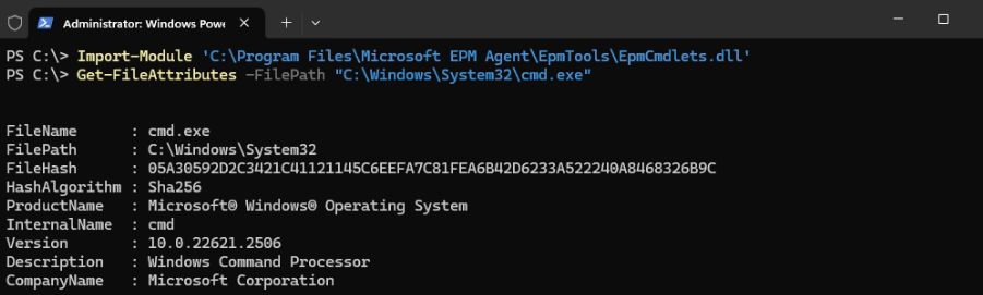 Once the EPM settings policy is deployed to an endpoint, you can use the EPM PowerShell module for some important tasks like getting file information. Import the module with: