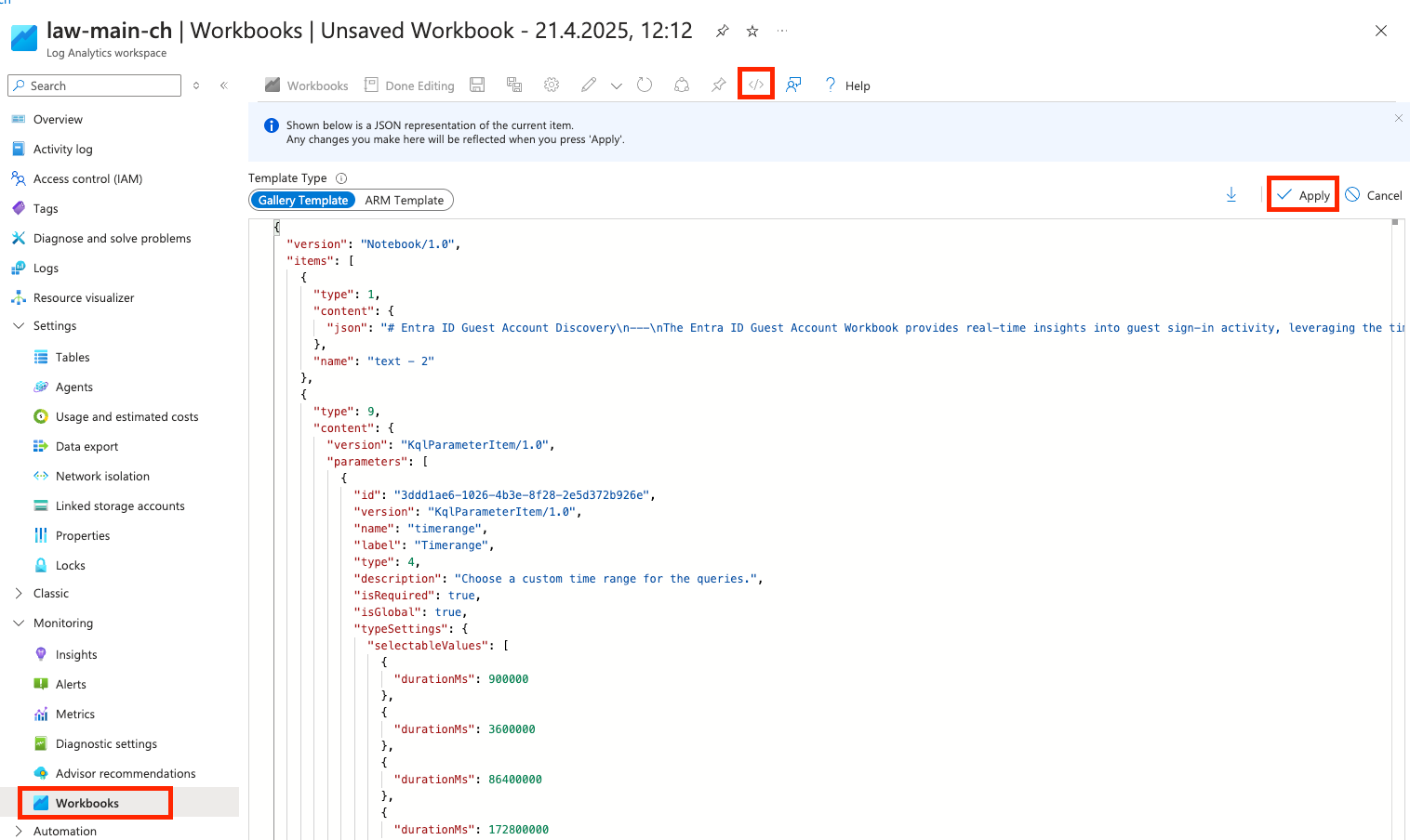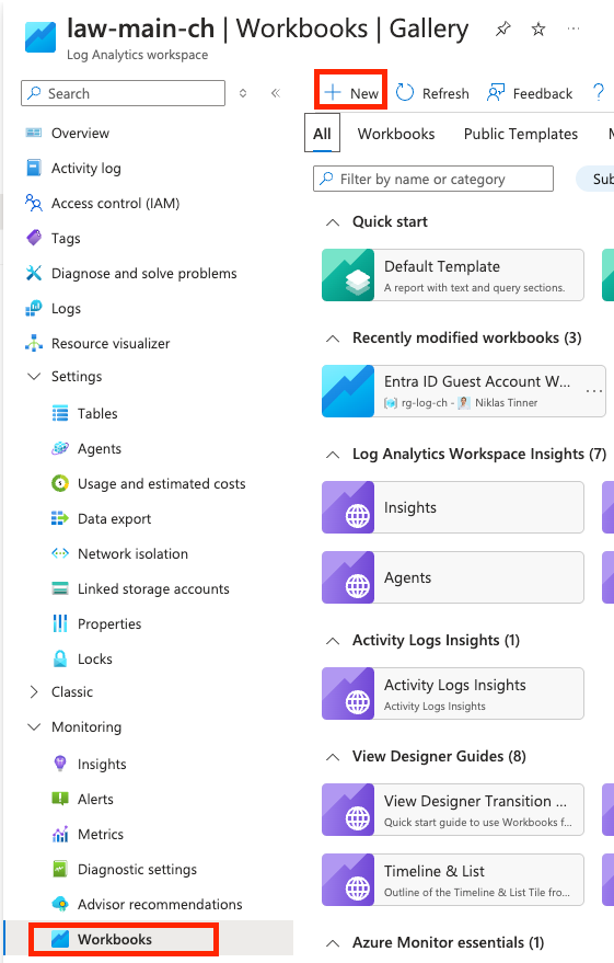 - Create a new Azure Workbook on the Log Analytics Workspace