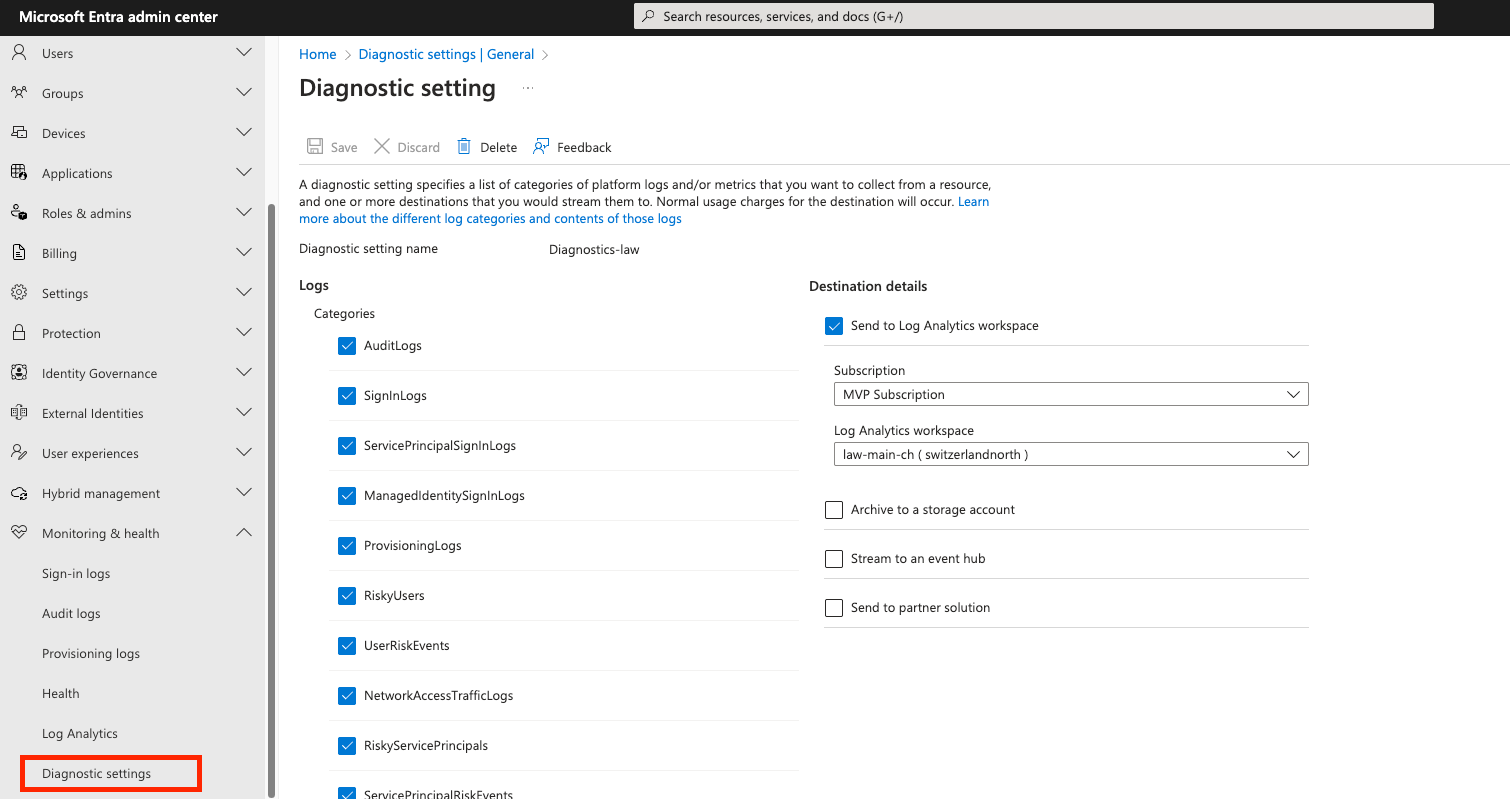 - Connect Entra ID diagnostics settings with that Log Analytics Workspace to instruct Entra to send logs to the workspace, so that we can query the data and use it in the workbook