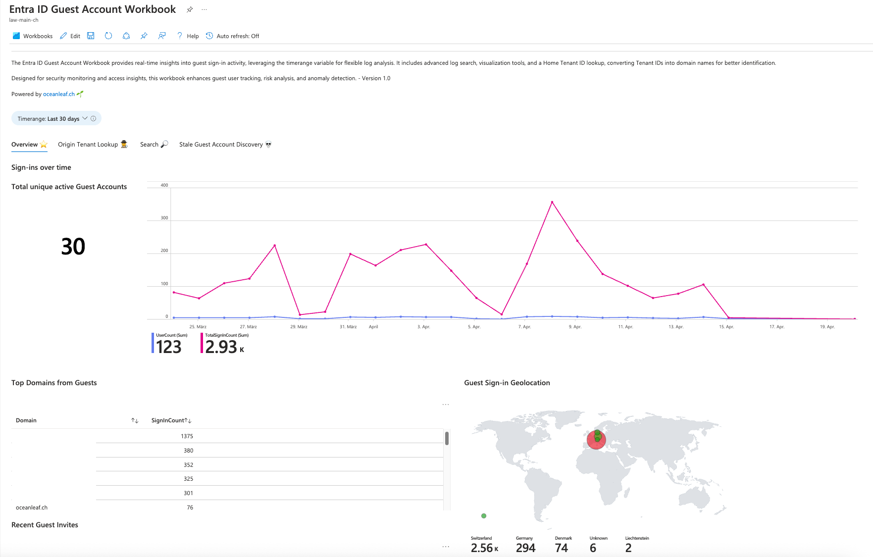 For a recent project, I was in the need for a solution to monitor & analyze guest account behavior in my tenant. A perfect use case for Entra ID Monitoring, with Log Analytics Workspace, Azure Workbooks and KQL. This combination allows us to discover logs from the identity provider and visualize through queries in Azure Workbooks. The Entra ID Guest Account Discovery Workbook provides: