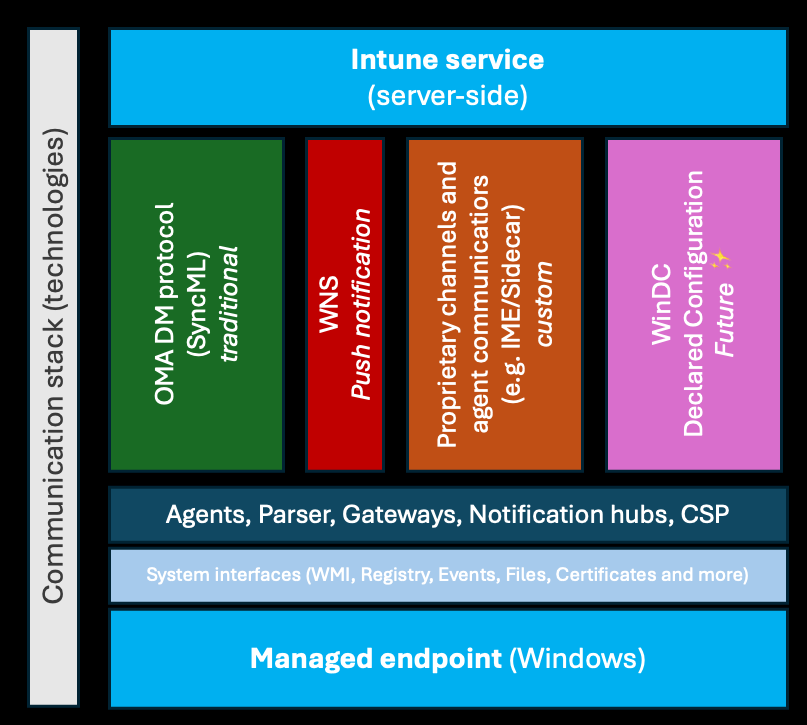 When the Intune service delivers a payload, a lot of things come to play. This is also why things go wrong mostly at this stage. Now we have to deal with different technologies, latency, payload delivery technique, translation between protocols and client-side performance. The most critical aspect is the secure connection between the server and the client. To establish it, they perform a handshake and start exchanging data, only when the security requirements are fulfilled. Depending on the content (relevance, type, occurrence or schedule) which is delivered, different communication channels are utilized. There are traditional protocols like OMA DM or the Windows Push Notification services for fast communication, other channels to support certain scenarios like the Intune Management extension and the future looks bright with WinDC with its declarative, efficient and reliable and of course state-of-the-art approach.