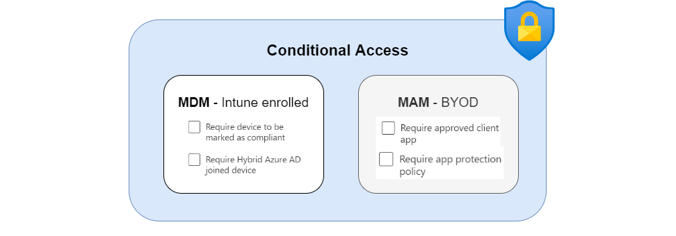 From a technical perspective there are the following grant controls which ensure an access is secured by either MAM or MDM. (some are only applicable to certain OS types) This is included in the grant option and should be set to "require one of the selected controls".