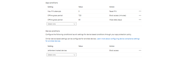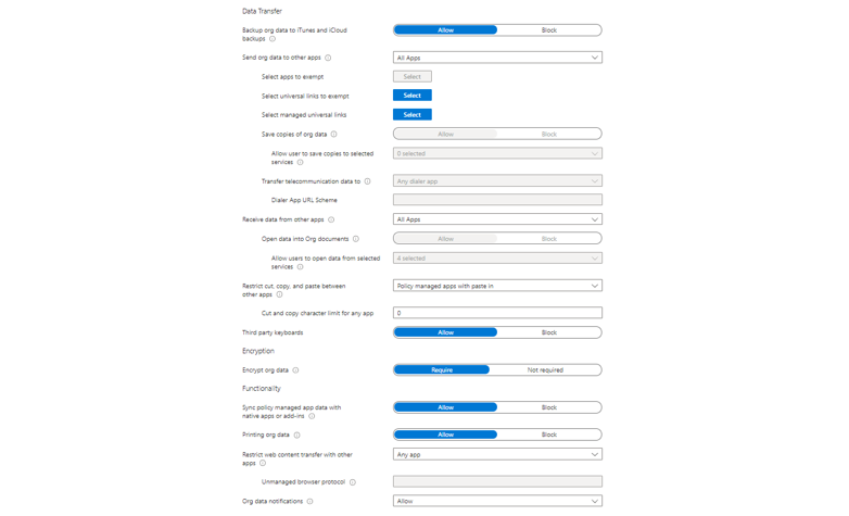 App protection policies are here to protect corporate data in managed apps and is part of Microsoft's MAM solution. These are available for iOS/iPadOS, Android and Windows 10 and later. These policies are usually applied when the device is not corporate managed and also hold personal data. The danger is that corporate data could be exfiltrated to other workloads on the device. App protection policies consists of three sections:
