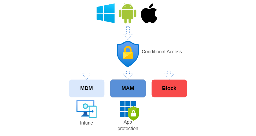 To control access for both MDM or MAM, you should implement a Conditional Access policy that validates the access requests to any Microsoft 365 service is coming from a managed device or app. Read more about Conditional Access