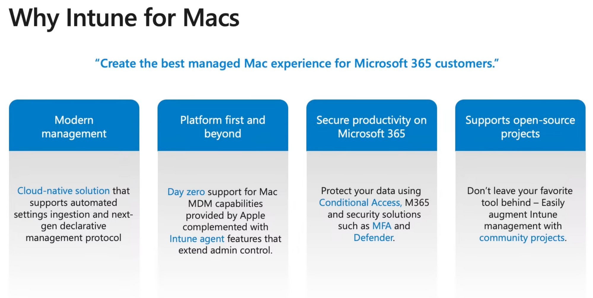 Intune is a cloud-based cross-platform endpoint product. With that, Microsoft is heavily pushing the macOS management story, providing day-zero support, expanding features and developing features to empower the end-user as well as IT admins for the Mac platform.