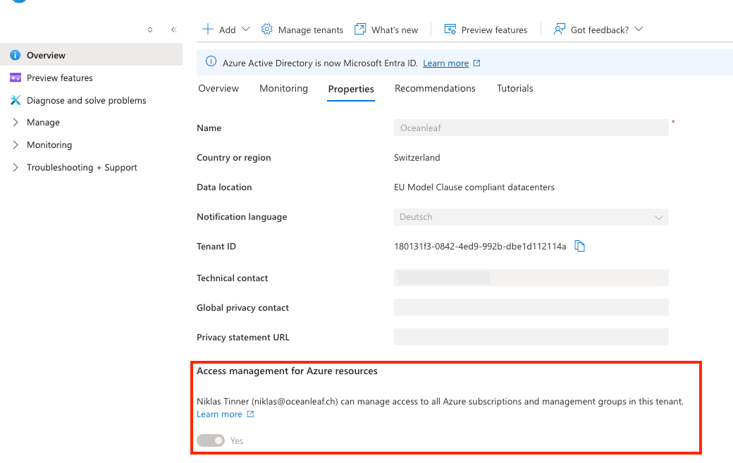 Someone with a Global Administrator role in Microsoft Entra ID can take over Azure resources. In principle, Entra ID and Azure don't share their RBAC, but Azure is using identities from Entra ID. At Microsoft Entra > Overview > Properties you can define if your Global Administrator roles have access to Azure, which is an important security consideration.