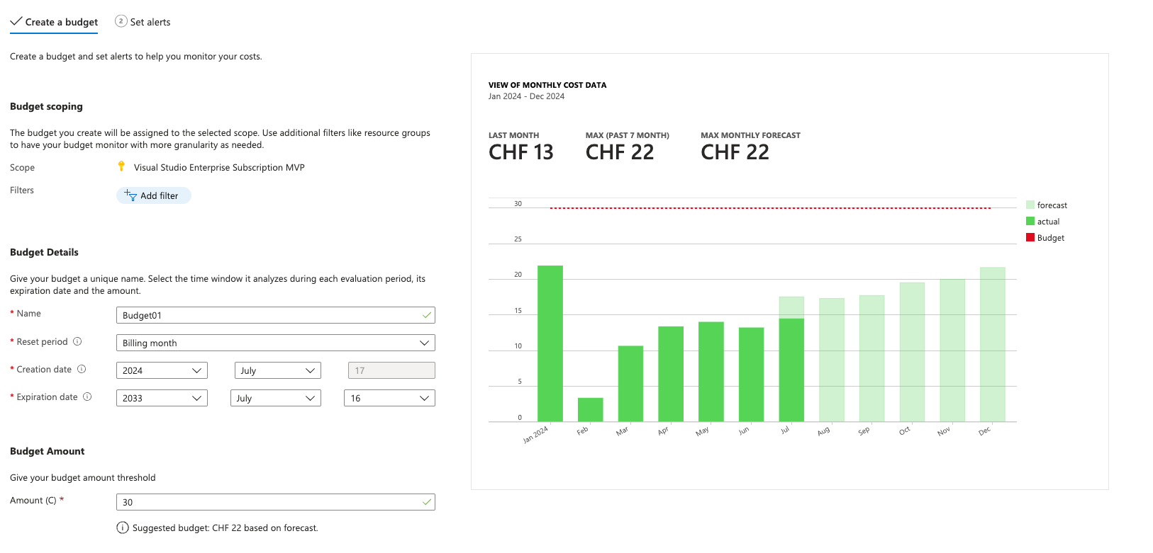 Every subscription should have configured at least one budget with a smart forecasting of the expected costs. If it actually or predictively reaches the budget, admins should receive a notification about it. Set a subscription budget at Subscription > Cost Management > Budgets