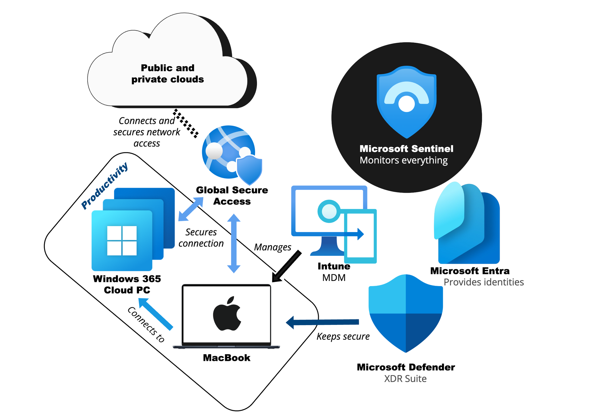 Global Secure Access acts as my network broker to private and public clouds around the world. It secures traffic through access channels and tunnels and connects me with the Microsoft global backbone network.