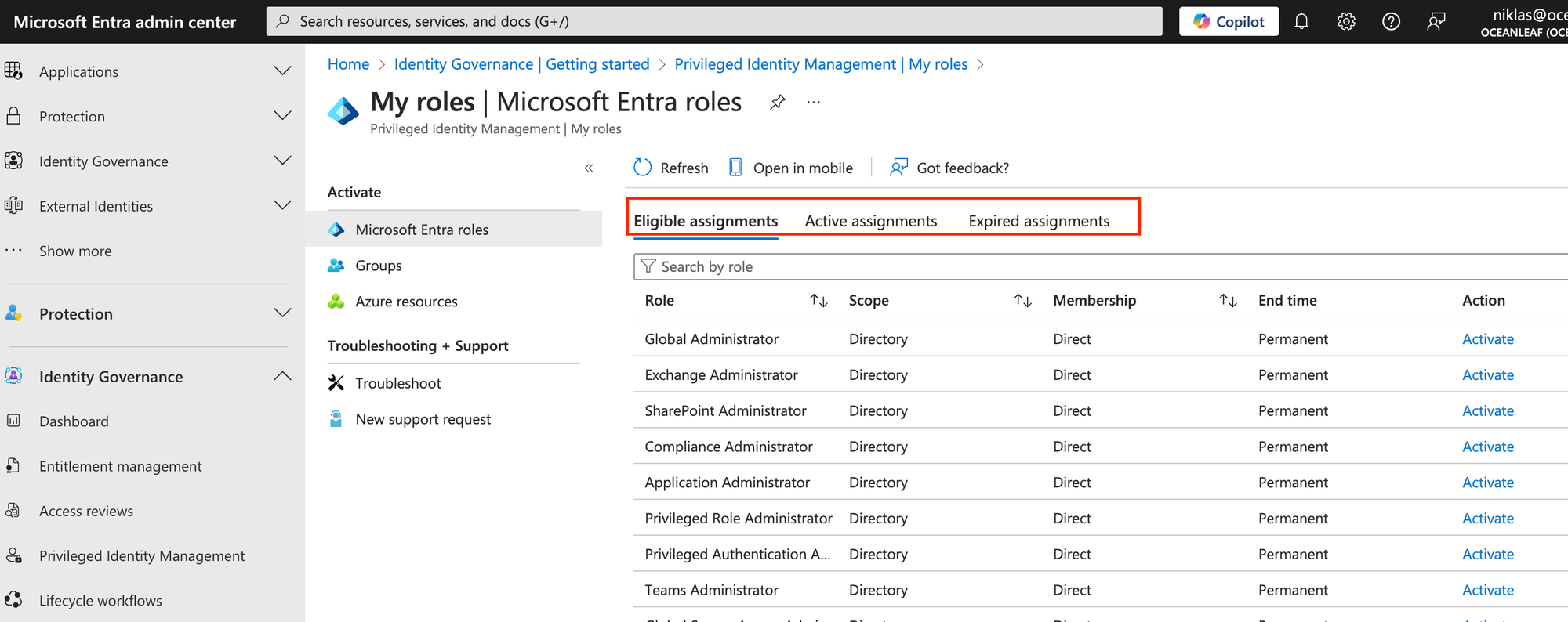 - Eligible: Role can be activated for a user via PIM for a specific period of time