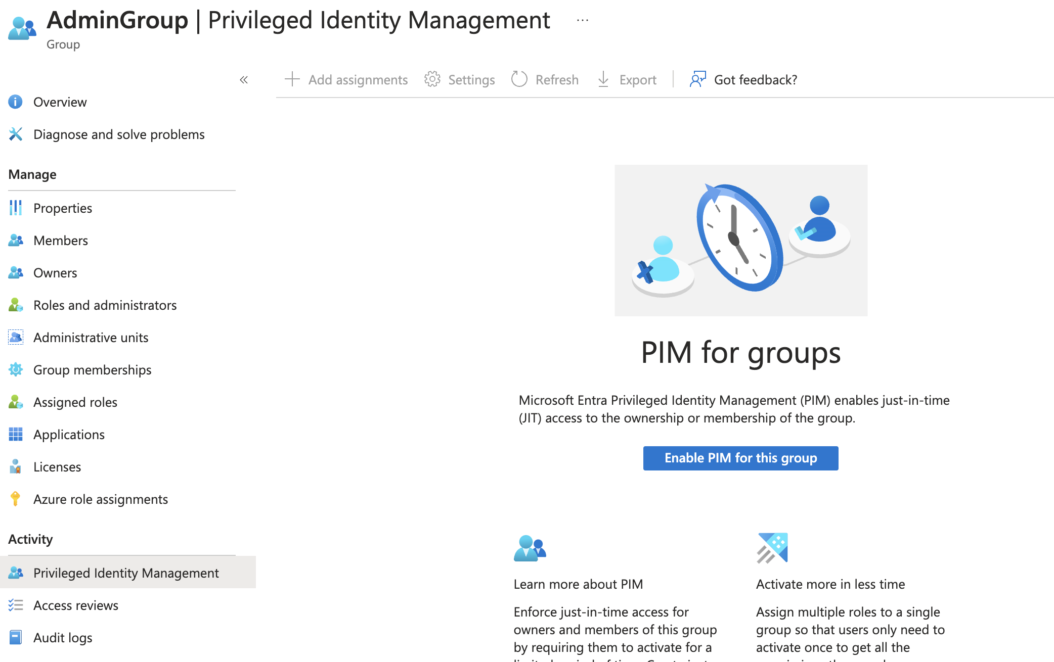 It is also possible to enabled PIM for groups. That means, you can be an eligible member of a group and activate the assignment for a limited timeframe. (Including all other features of PIM) This is a nice feature, when you assign privileges to groups, e.g., in for Intune custom RBAC roles.