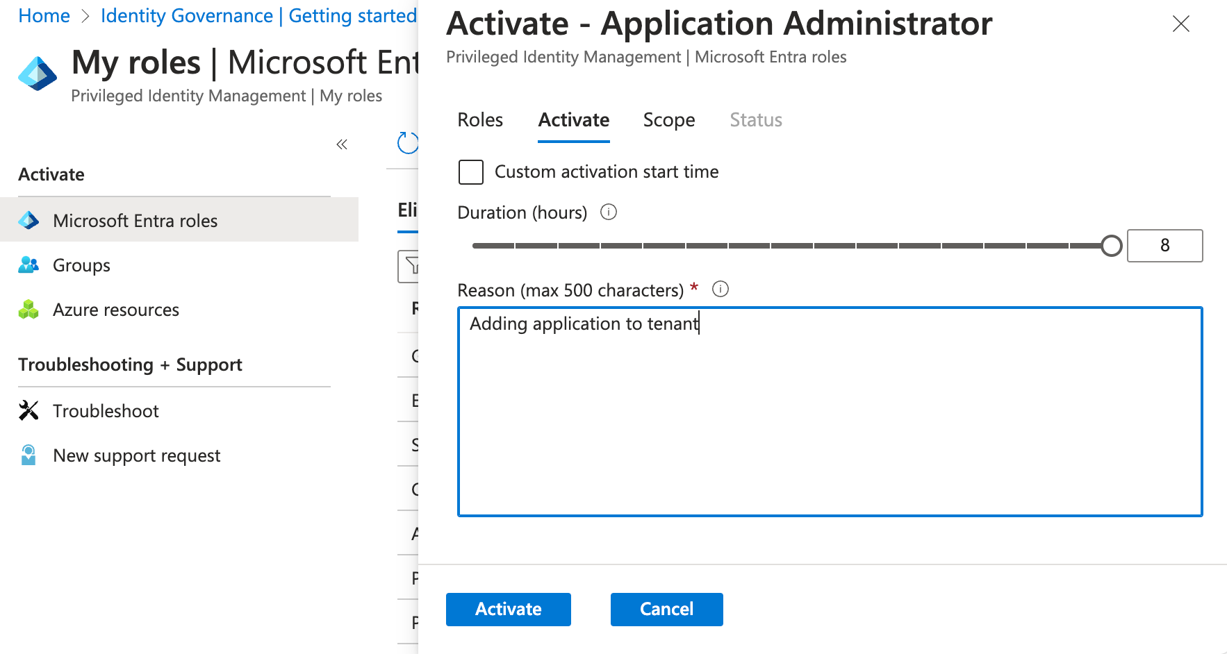 Now, to activate a role, choose the correct, hit "Activate" and provide the justification (required). Optionally: