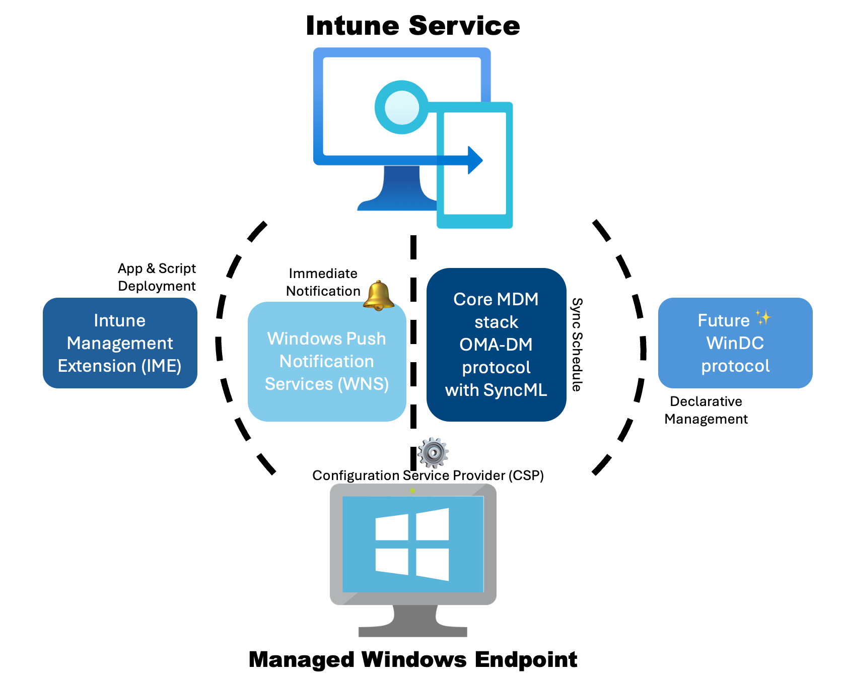 - OMA-DM Protocol β The engine that drives policy deployment and syncs changes (check-ins from endpoints to the Intune service).