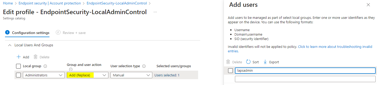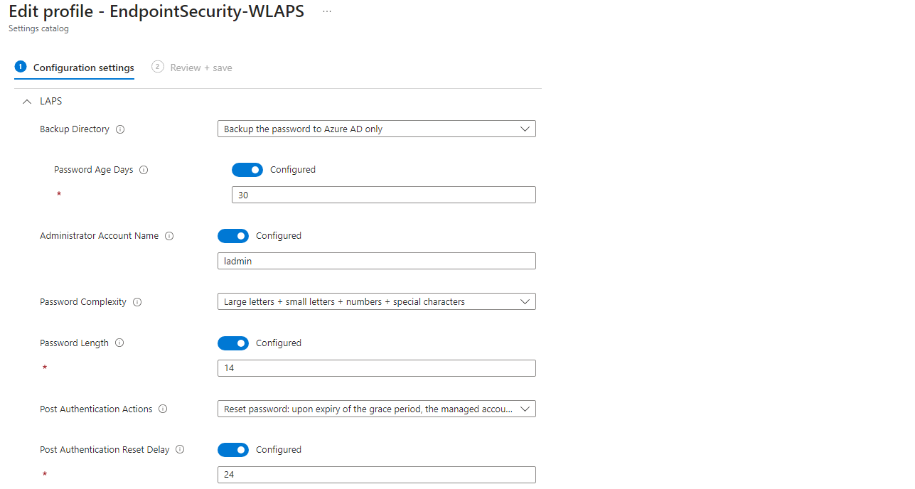 - Create an Intune Endpoint Security, Account Protection, LAPS policy to define the behavior and settings of LAPS