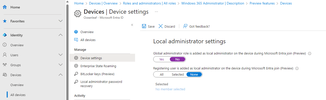Furthermore, there is a new Entra ID device setting that allows to configure the local administrator user members of your tenant. I would configure both to 'none'.