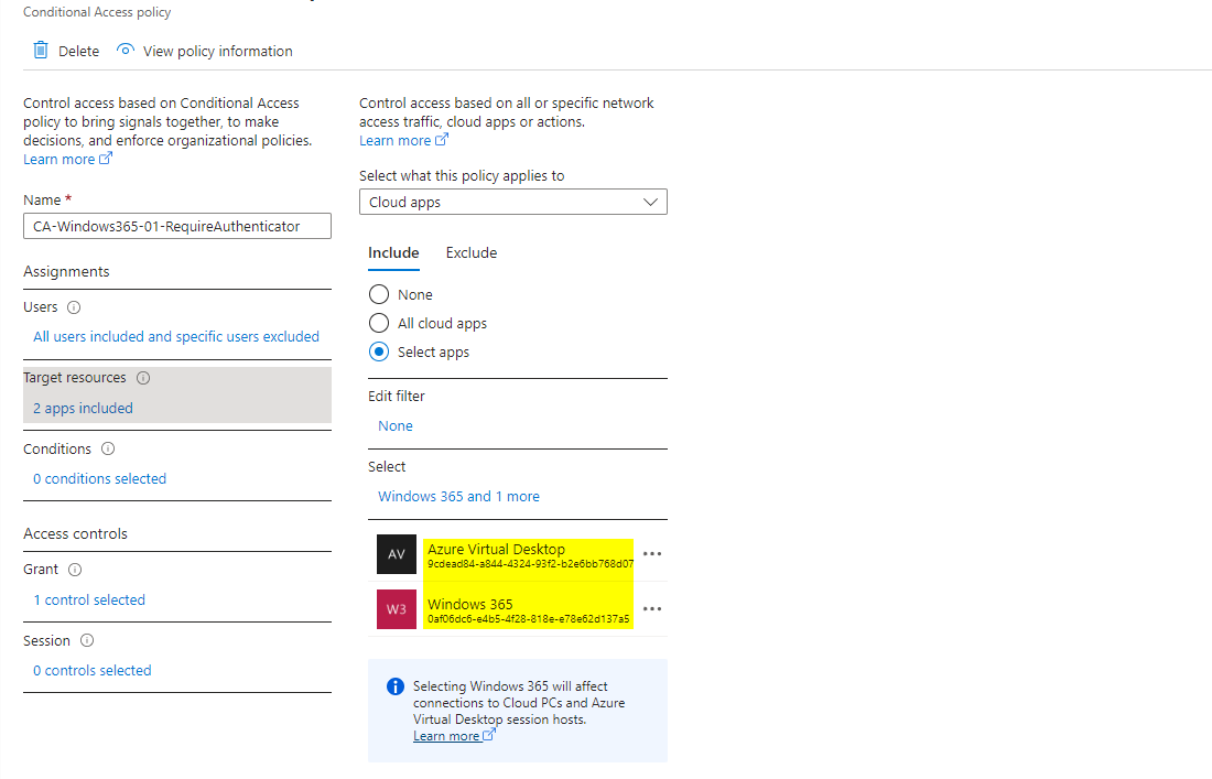 To protect the identity layer and access to Cloud PCs you should consider Conditional Access. Combine different signals and conditions to ensure access to the service is valid. In Conditional Access you should choose the Windows 365 and Azure Virtual Desktop as target cloud apps to catch all authentication that could come against W365.