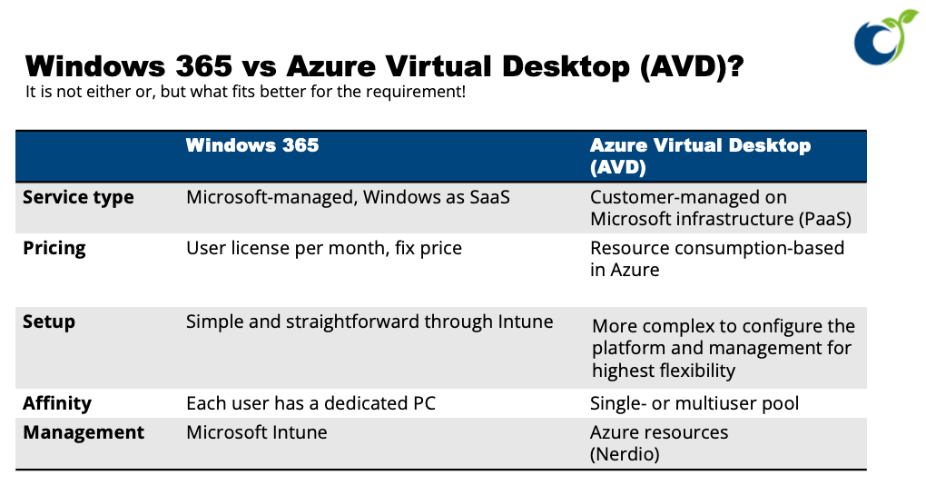 Windows 365 and its sister Azure Virtual Desktop (AVD) share a common principle and under the hood it is (almost) the same technology. It is important to mention, that it is not either or, but what fits better to the requirement. See the overview of both solutions: