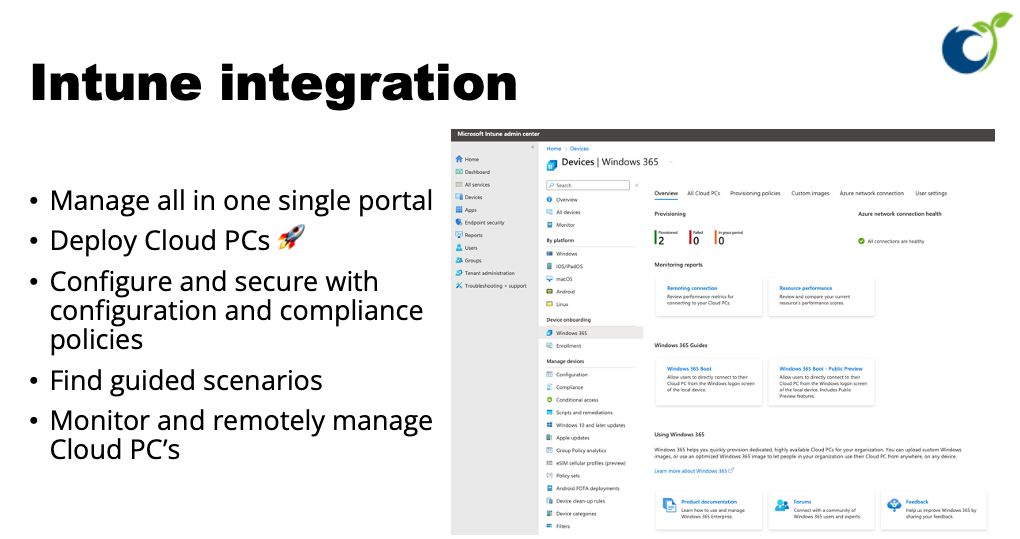 Last but not least, I want to emphasize the management integration with Intune. Image the scenario where you don't just manage mobile platforms, but also the virtual endpoints through a single, unified solution! It is truly a cross-platform management solution for all platforms, including Windows 365.